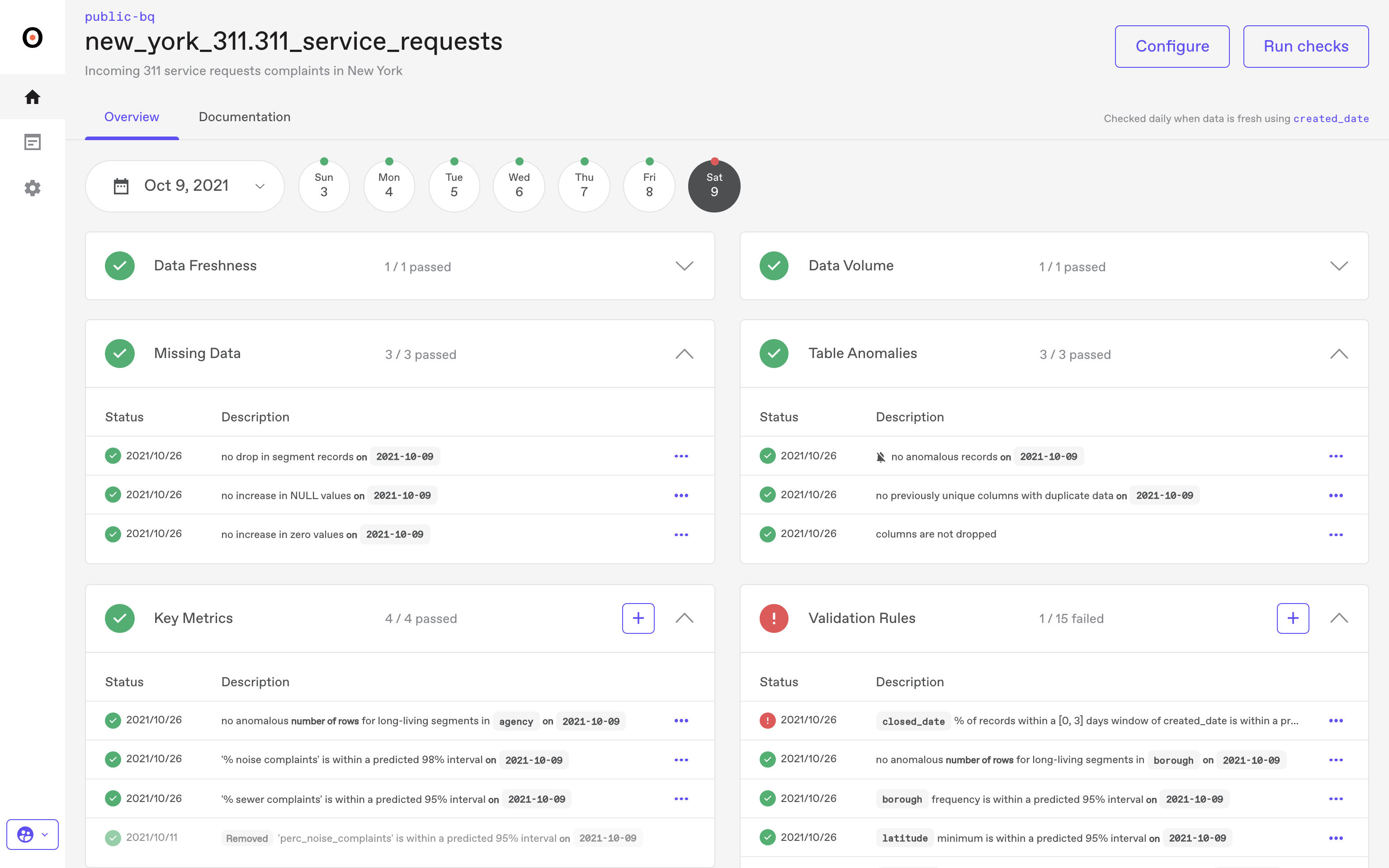 Anomalo runs daily by default, checking tables after new data is fully delivered. While custom schedules are supported, it's not optimized for real-time or streaming data, making it a weaker fit for those needing instant visibility into dynamic data environments.