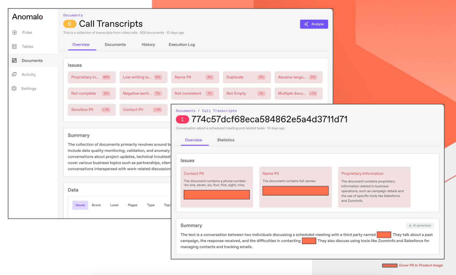 With Anomalo you can measure, monitor, and enhance the quality of their unstructured document data, such as customer support transcripts, user-generated content, and regulatory reports, before using it for AI and analytics initiatives.