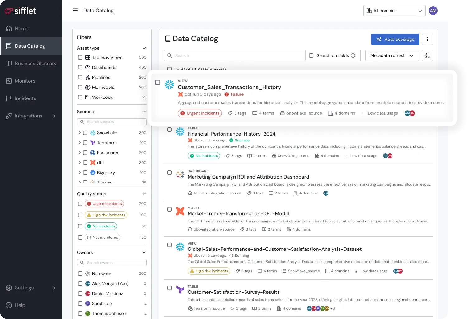 Sifflet’s data catalog unifies technical metadata, business definitions, operational performance, and usage patterns in a single live workspace. It’s where datasets, definitions, lineage paths, and quality metrics converge, all updated automatically as systems evolve.