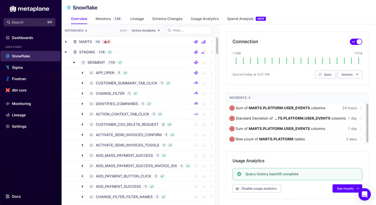 Metaplane's focus is primarily on tables. It won't tell you an Airflow job is choking or Snowflake compute is draining your budget.