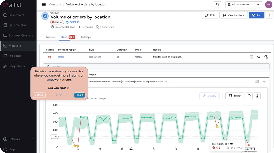 Sifflet monitors your data estate end-to-end, detects anomalies early, and helps your team pinpoint root cause fast so they can keep dashboards, models, and pipelines stay reliable as you scale.