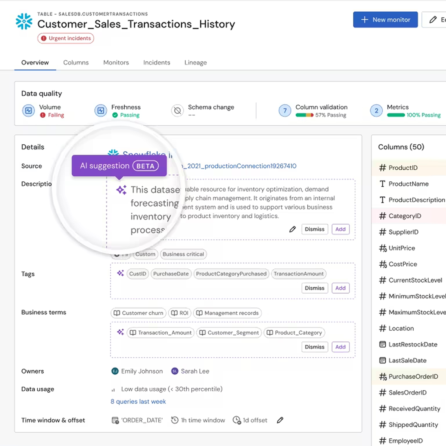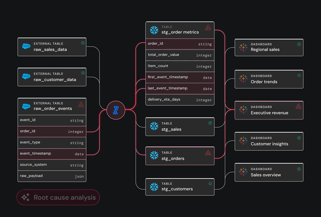 Lineage, queries, logs, and change history are linked automatically. Root cause becomes visible without dashboard hunting.